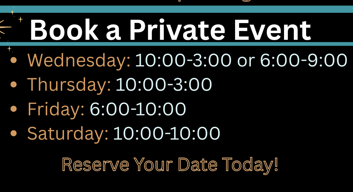 Birthday Parties, Bachelorette Parties, Bridal Showers, Baby Showers, Girls’ Night Out, Date Night, Family Gatherings, Team Building, Holiday Parties, Organization Meetups, Retirement Parties, Just-for-Fun Creative Get-Togethers, &